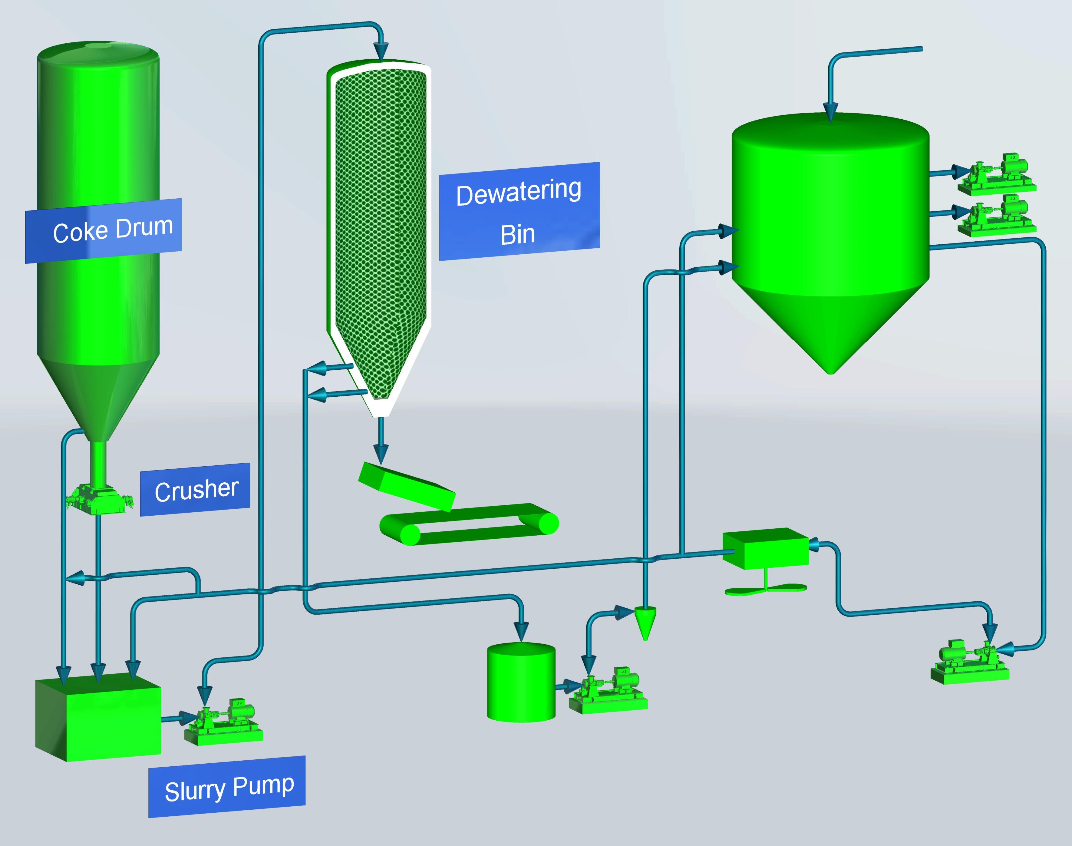Während des Decokings wird der Koks mit Hilfe von Hochdruck-Schneidwasser aus der Coke Drum geschnitten. ECHO schließt direkt unterhalb der Coke Drum mit der Zerkleinerung des Petrolkoks' an. Dann wird der Koks in eine Dewatering Bin (Entwässerungsbehälter) befördert, wo das Wasser abfließt, und schließlich an ein Fördersystem übergeben.